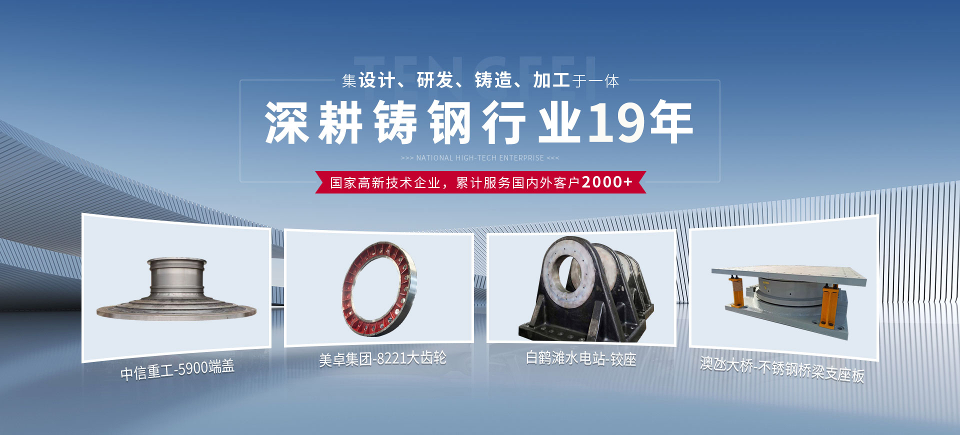 騰飛鑄鋼成立于2006年,位于全國鑄造基地河南省新鄉市,擁有員工300余人,是一家從事150噸以下碳鋼、低合金鋼、不銹鋼鑄鋼件研發、制造、服務為一體的國家高新技術企業?! 」就ㄟ^了ISO9001國際質量管理體系認證,擁有2項發明專 利,2項河南省科技成果、25項實用新型技術,通過了“環??冃гu級B級企業”驗收,先后榮獲“河南省鑄造行業綠色發展企業”、 “河南省科技型中小企業”、“河南省專精特新中小企業”等榮譽稱號。  公司擁有2臺25噸電爐,4臺大型天燃氣熱處理爐、10米回旋自動拋丸機一臺, φ8m數控立車、φ10m數控滾齒機等各類高精裝備100余臺套,年產能3萬余噸,能為客戶提供從產品設計、木模加工、大型鑄造、大型加工一站式服務,產品廣泛應用于建材、冶金、鍛壓、冶金、水工、路橋、化工等多個重型行業。  長期服務于中信重工、中船重工、美卓、上海中交、萊歇、寶武、濟南重工等全球知名企業,在行業內擁有較高的市場知名度和美譽度。